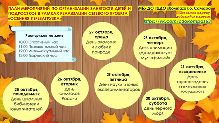 Мероприятия на осенние каникулы 2021г.Мероприятия на осенние каникулы 2021г.Программа он-лайн каникул на 25 октября 2021 года